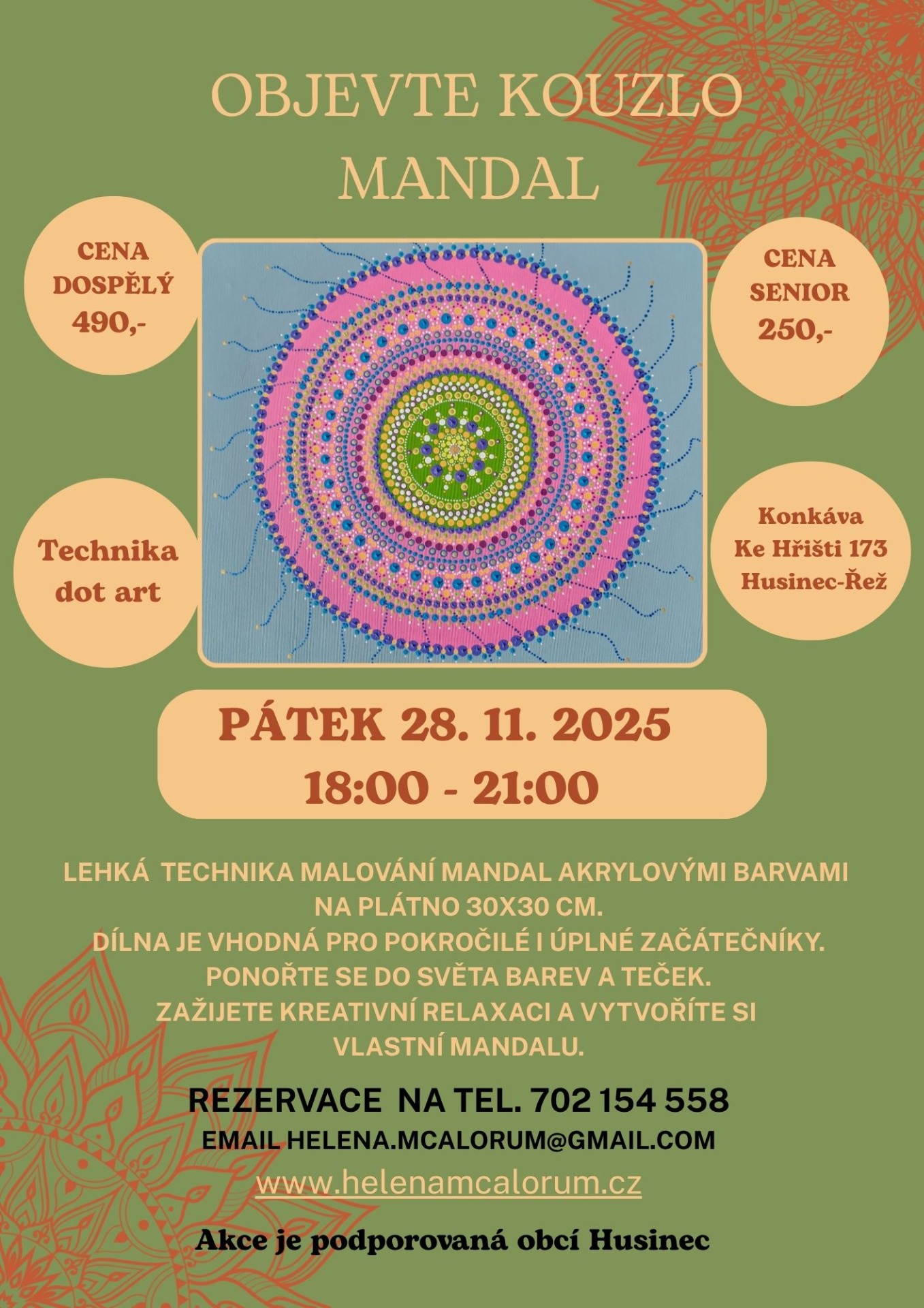 Přijďte se ponořit do světa barev a teček. Lehká technika malování mandal akrylovými barvami na plátno.